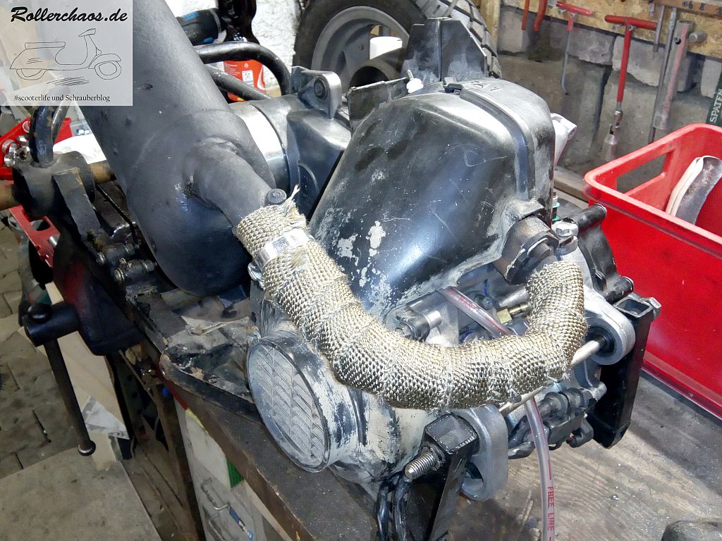 Anstelle des originalen Hitzeschilds bekam der Krümmer dann einen Wickel aus Hitzeschutzband. So ist nicht nur das Helmfach gegen die Wärmestrahlung geschützt, sondern auch die Ölpumpe.