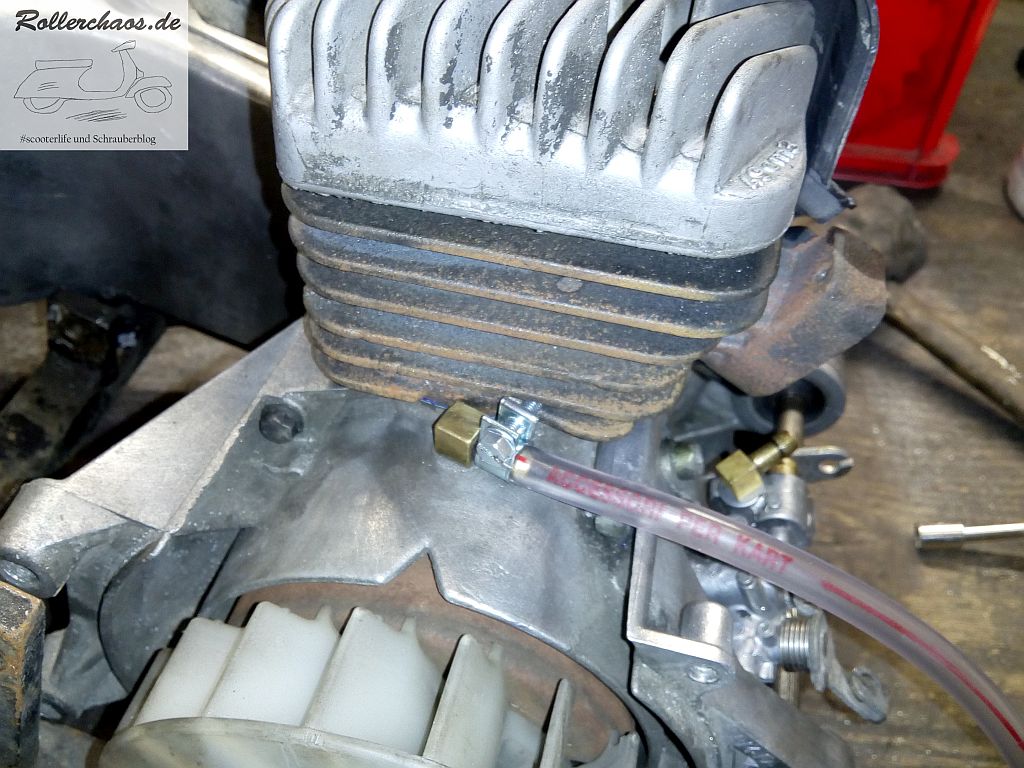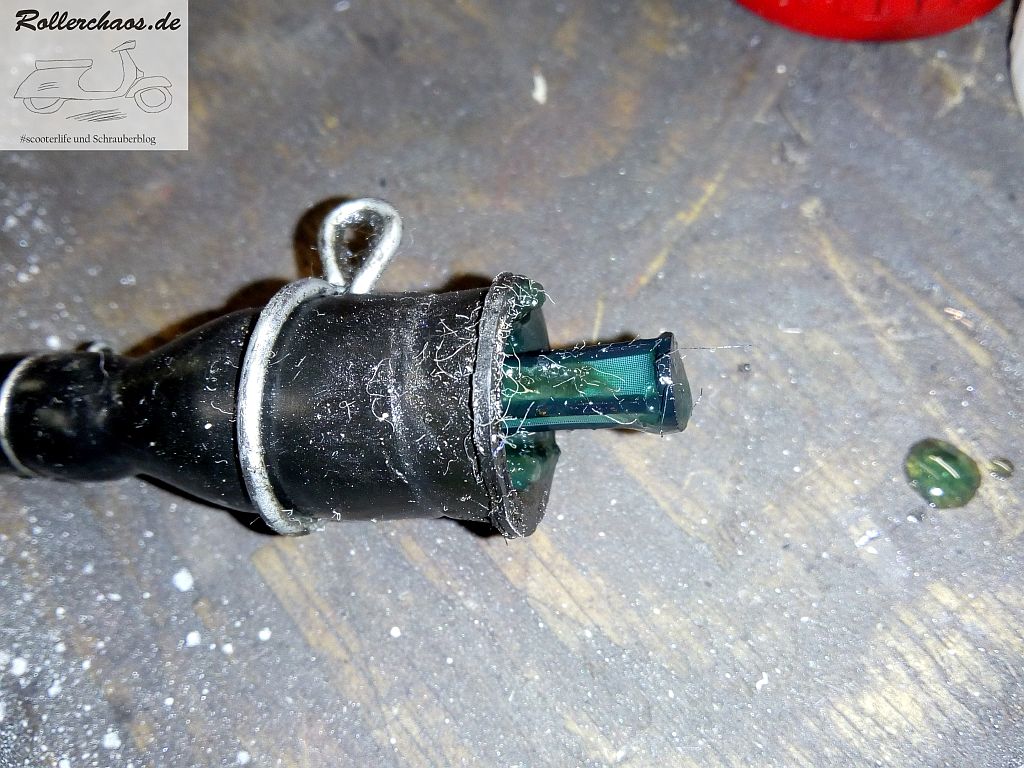 Schwierigkeiten gab es dann allerdings bei der Ölversorgung. Der Filterstutzen im Tank erwies sich als völlig verschmutzt. Hier ist noch Arbeit nötig. Da bei den ersten Motorstarts sowieso Zweitaktmix im Tank sein muss, habe ich das aber auf die Zukunft vertagt. Heute ging es dann darum, den Motor zum Leben zu erwecken.