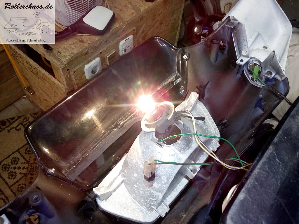 Ursache für den nicht funktionierenden Scheinwerfer war schlicht eine ausgebrannte Birne. Ebenso hatten sich die Lamperl der Tachobeleuchtung verabschiedet. Auch hier war also eine einfache Lösung möglich.