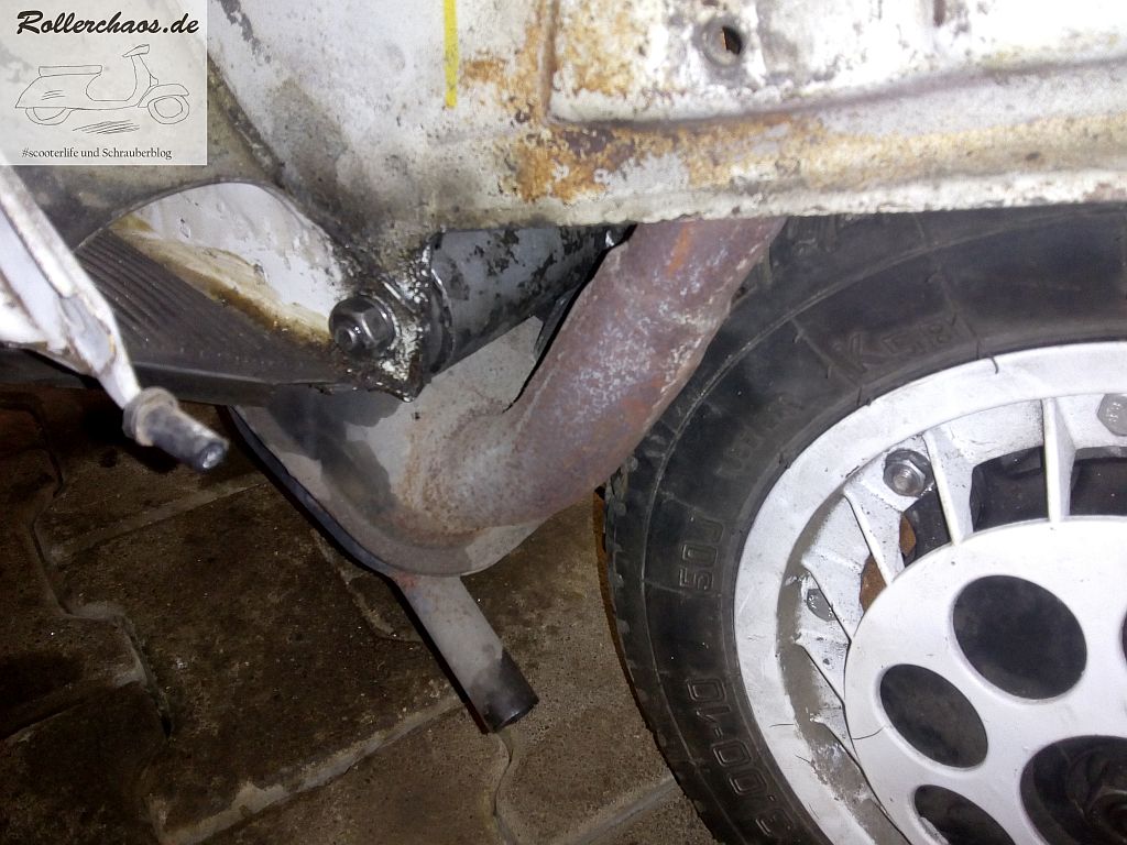 Zu den noch ausstehenden Arbeiten zählte nämlich unter anderem, den Kotflügel gerade zu richten. Keine ganze einfache Aufgabe, denn der Kotflügel ist verbogen. Der Roller hat im Laufe seines Lebens schon mehrfach einen auf die Nase bekommen, was sich hier deutlich zeigt.